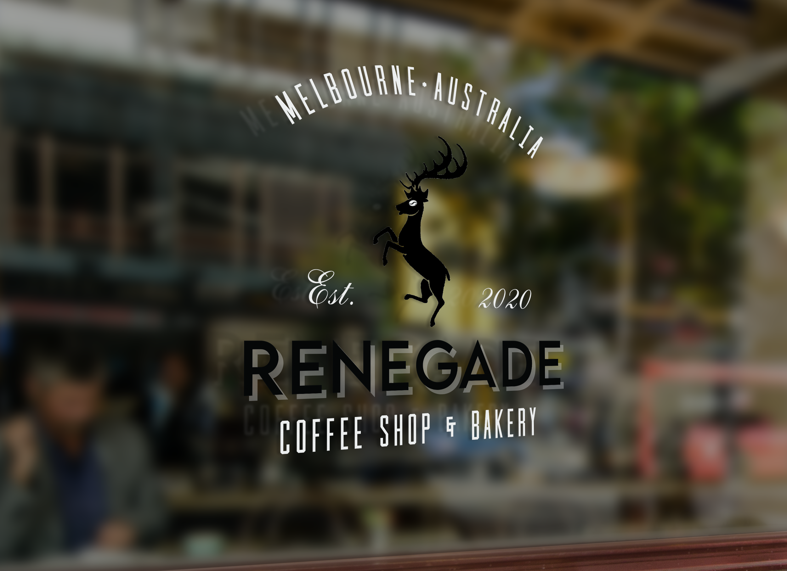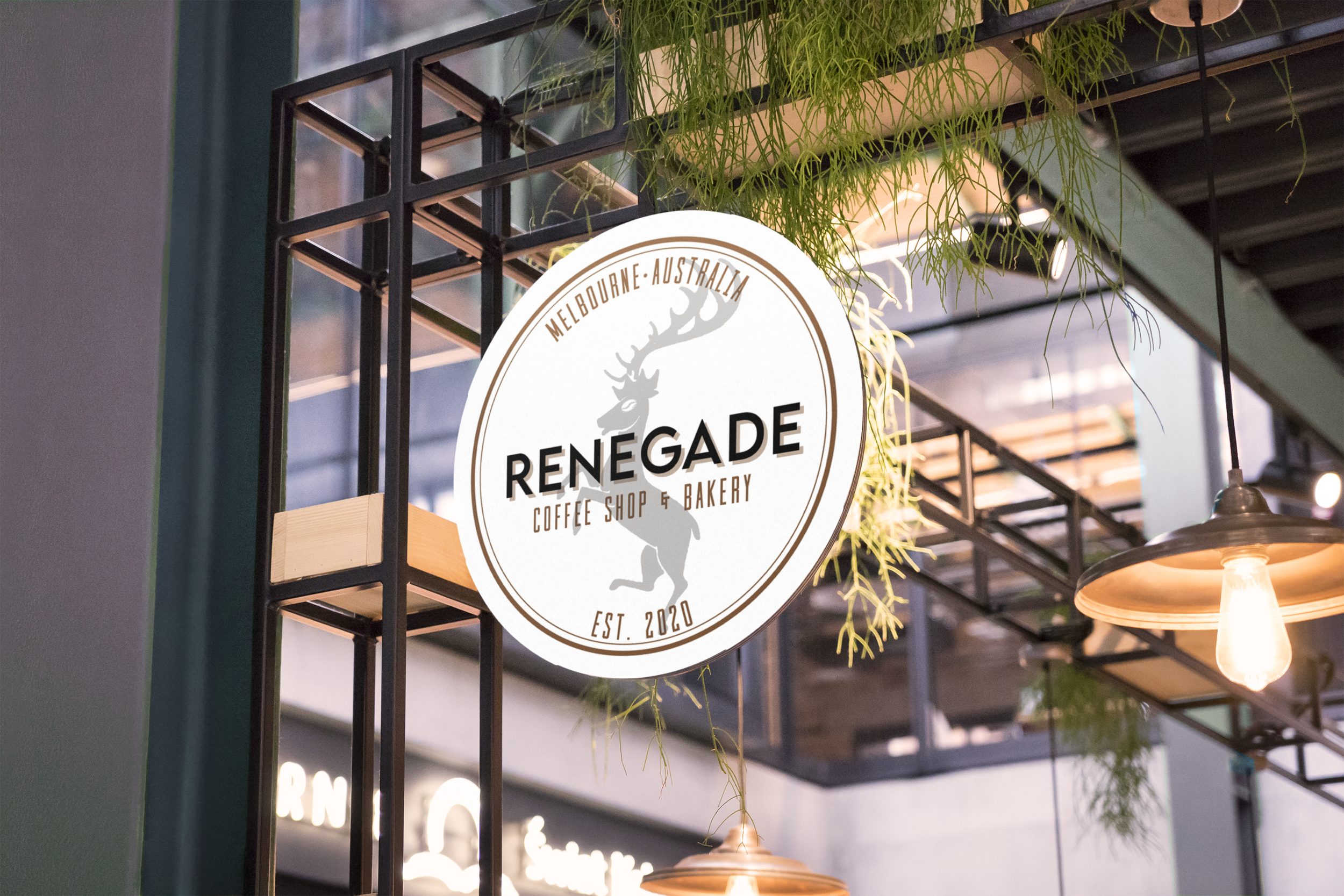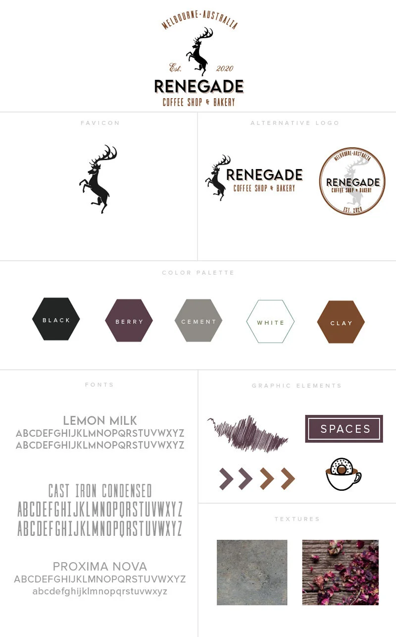 Renegade - a mock story. Local coffee shop & bakery, Renegade, has a bold, industrial style and wanted their coffee shop and bakery to be “the go-to spot” for local neighborhood for coffee and treats. Muted deep purple and clay colors were brought in to counter balance the bold, masculine slightly edgy style of the black, grey and white. Custom graphics and patterns were also created.